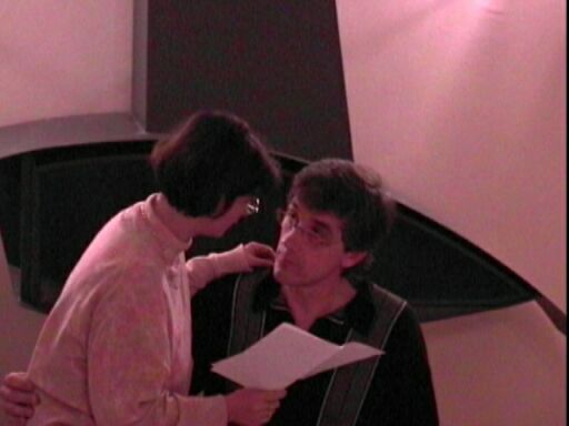 | Dimanche après-midi, nous travaillons sur divers textes. Ici, Cécile et Denis jouent une scène de Roméo et Juliette. |
