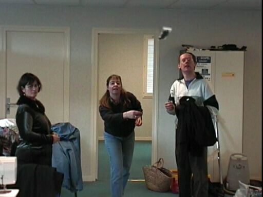 | Il y a même un concours de lancer de boutons, sous l'oeil admiratif de Patrick et celui, plus perplexe, de Cécile. |