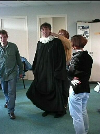 | Muriel ayant fait énormément de travail préparatoire, cela va vite. Voilà déjà Denis en médecin, avec sa collerette. |