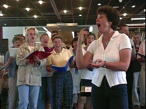 | Le public est invité à participer et à reprendre le refrain de « il tape sur des bambous » avec le choeur. |