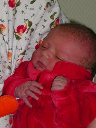 | Ce matin à 2 heures moins 20 est née la petite Daphné. Après les têtées son visage est presque aussi rouge que son pyjama, mais le reste du temps elle va très bien, merci. |