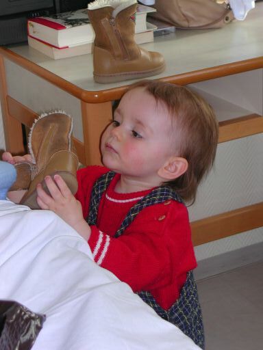 | Élodie est venue voir sa maman et sa soeur. Avant de monter sur le lit, elle retire ses bottes. |