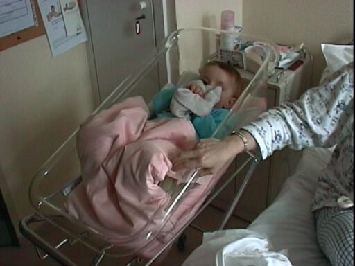 | Profitant de ce que Daphné n'y est pas, et aussi du fait que les infirmières ne sont pas encore venues nous réprimander, Élodie essaye le berceau. |