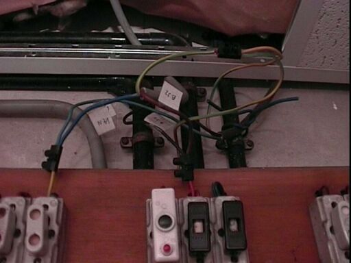Détail sur l'immonde bidouille destinée à alimenter la cuisine d'été et l'adoucisseur d'eau. Noter que les fils de terre, ici comme dans la cuisine principale, n'étaient en fait pas reliés à la terre.