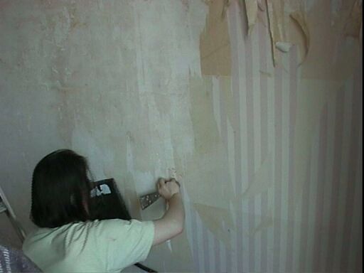 | Marie-Christine décolle le papier-peint de la chambre d'Élodie tandis que celle-ci dort dans son parc. |