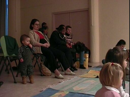 | Élodie n'arrive pas à se décider entre rester assise à côté de sa maman et rejoindre les autres enfants sur le tapis. |