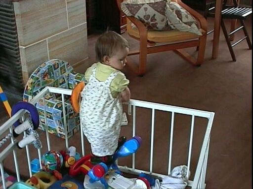 | Un mois plus tard, Élodie ne sait bien sûr pas marcher sans se tenir, mais elle tente déjà des acrobaties. Ici, elle grimpe sur son « chien à roulettes » après l'avoir renversé. |