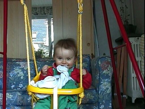 | L'un des cadeaux offerts à Élodie pour son premier anniversaire est cette superbe balançoire. Quand elle y est, il est très difficile de l'en sortir. |