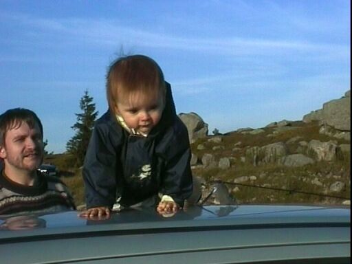 | Un peu plus tard, au Truc de Fortunio. Les trucs en Lozère sont des sommets élevés. Élodie, ne se trouvant pas assez haut, grimpe encore sur la voiture. |