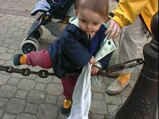 | Aidée par sa maman, et sans lâcher le doudou, elle trouve toute seule comment enjamber la chaîne. |