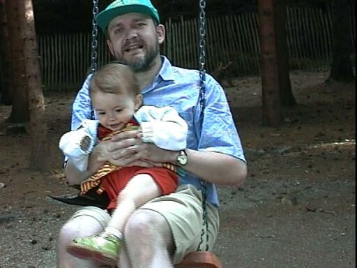 | Prés de la réserve de bisons d'Europe (Sainte-Eulalie), il y a quelques jeux dont une balançoire pour Olivier et sa fille. |