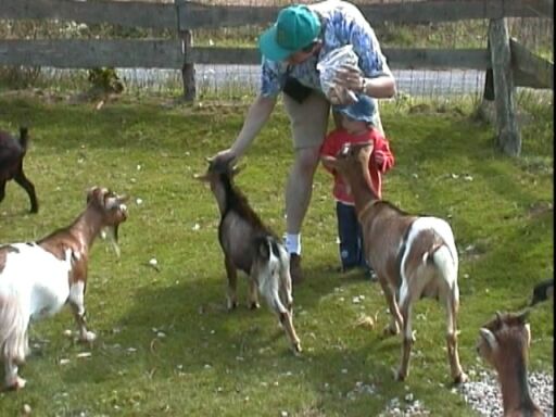| Vers la fin de la visite, nous entrons carrément dans l'enclos des petites chèvres, pour lesquelles il nous était conseillé de garder du pain. |