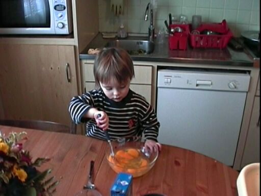 Recette de cuisine illustrée : préparation d'une omelette de six œufs.