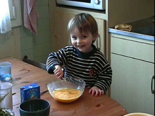 Recette de cuisine illustrée : préparation d'une omelette de six œufs.