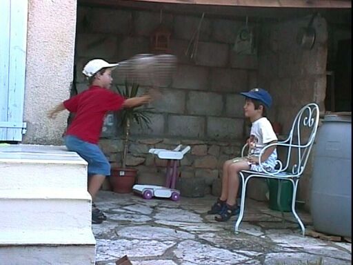 Hugo et Maël jouent au jeu des « cascous » dans lequel il faut viser une CASquette avec un COUSsin