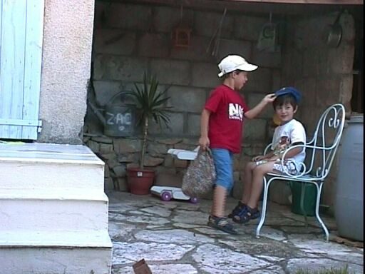 Hugo et Maël jouent au jeu des « cascous » dans lequel il faut viser une CASquette avec un COUSsin