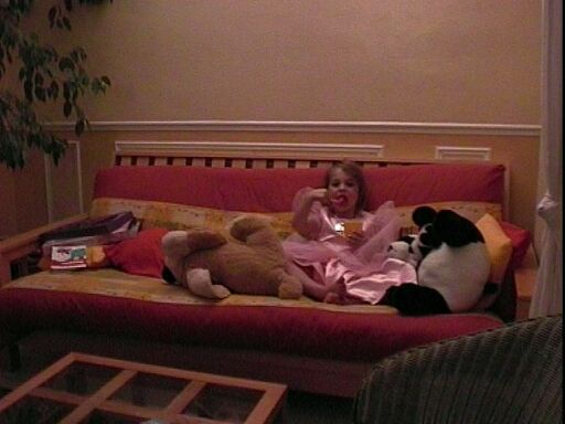 | Quelques semaines plus tard, venus fêter les 4 ans de Camille, nous assistons au repas de la princesse entourée de ses sujets les « mémés » (peluches). |