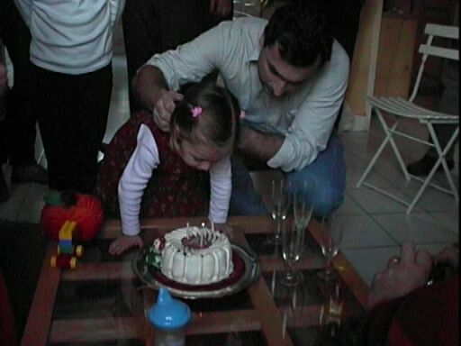 | Elle éteint d'un seul souffle les trois bougies, mais... |