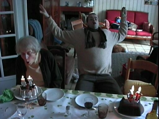| Voici enfin venu le moment pour Simone et Jean-Yves de souffler chacun deux bougies (soit une de moins que Romane dix jours plus tôt). Notez les différentes techniques... |