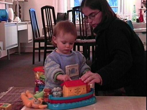 Aidé par sa maman, Élodie joue avec un jouet musical.