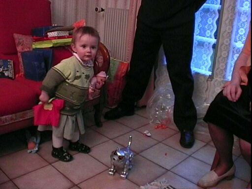 | Pourtant, Élodie reste intriguée par le chat-robot, et elle l'observe... tout en restant quand même à bonne distance. |