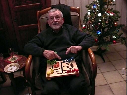 Papy Claude continue à essayer les jouets d'Élodie. Ici, il vient de réussir à rassembler les pions de la même couleur. Chapeau !