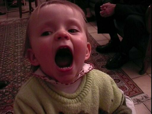 « Ah ! Je ris de me voir si belle en ce miroir (l'écran du caméscope) ! » - D'après ses mimiques, je suis maintenant certain qu'Élodie se reconnaît dans l'image du miroir, malgré tout ce que j'ai pu entendre à ce sujet.
