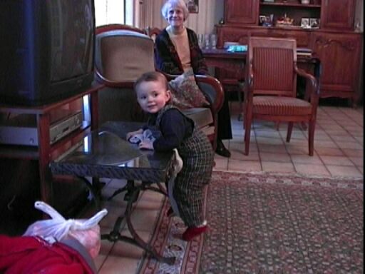 | Sous l'oeil amusé de Simone, Élodie tente d'atteindre le magnétoscope. |