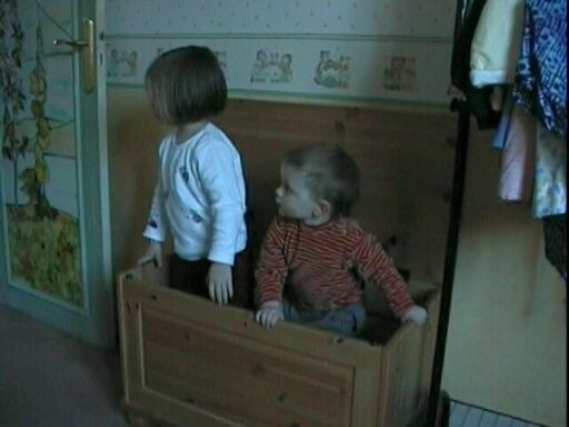 | Camille n'est pas venue, mais Romane est ravie d'entraîner Élodie à faire des bêtises, par exemple se cacher dans le coffre à jouets. |